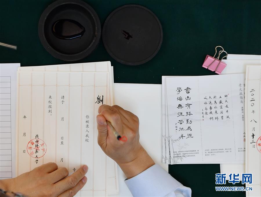 8月13日,陜西師范大學在職教師王雙懷書寫錄取通知書。當日,陜西師范大學2020年手寫錄取通知書正式開筆。該校自2007年起采用毛筆書寫錄取通知書的方式,為新生傳遞佳音。今年,學校十余位退休教師、在職教師、校友代表等書法愛好者將為約4500名新錄取的本科生送上帶著墨香的大學錄取通知書。新華社記者張博文攝