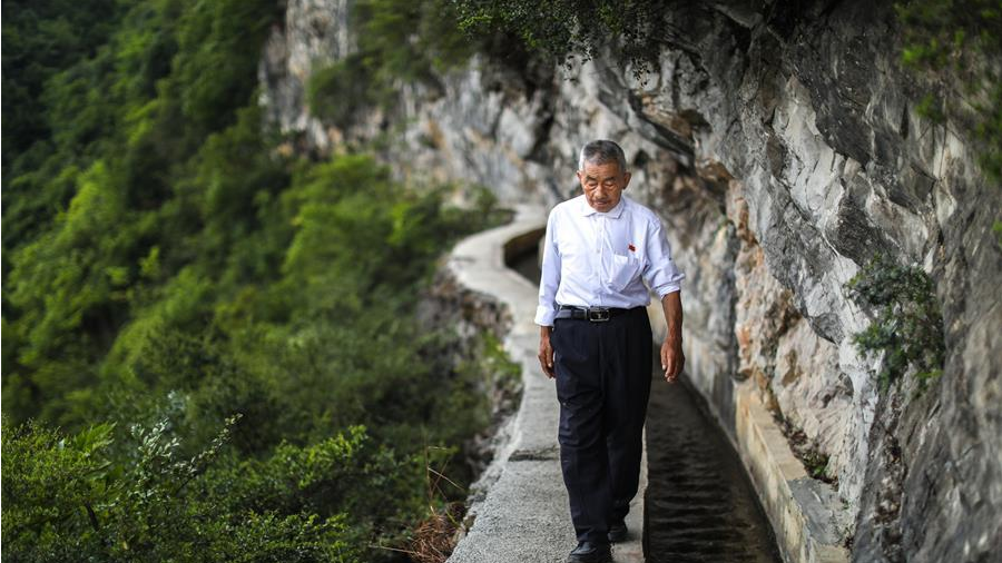 貴州遵義播州區(qū)團(tuán)結(jié)村老支書黃大發(fā)沿著修建在絕壁上的“大發(fā)渠”巡查。