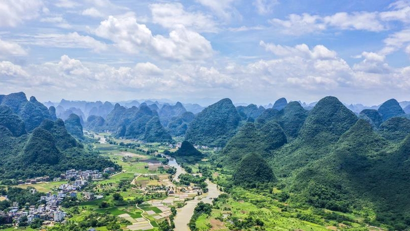 時(shí)值夏日,廣西桂林市陽朔縣景色宜人,青山綠草、藍(lán)天白云構(gòu)成一幅幅美麗的山水畫卷。