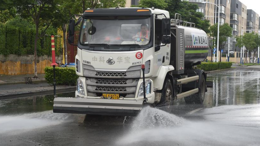6月15日,在合肥市廬陽經(jīng)濟開發(fā)區(qū),工作人員駕駛灑水車清潔路面。
