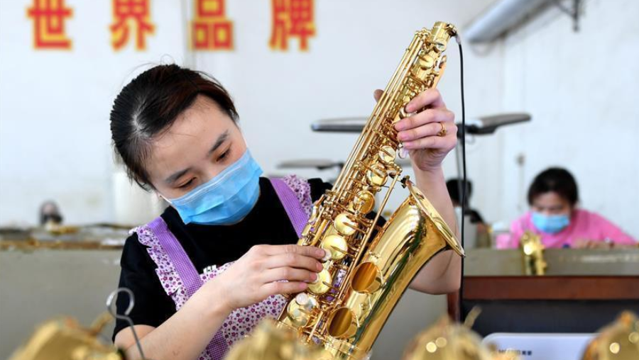 6月2日,工人在武強(qiáng)縣一家樂(lè)器廠生產(chǎn)車間內(nèi)組裝薩克斯。