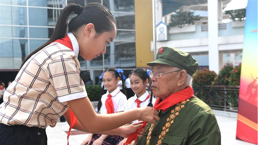 在北京市海淀區(qū)中關(guān)村街道青云北社區(qū),胡欣然(中)與社區(qū)工作人員(左)一起為社區(qū)居民發(fā)放垃圾分類宣傳手冊。