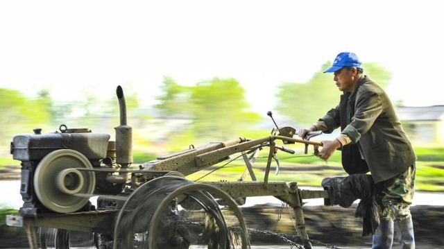 5月17日,在吉林省長春市雙陽區(qū)徐家村,農(nóng)民在水稻田間耕作。