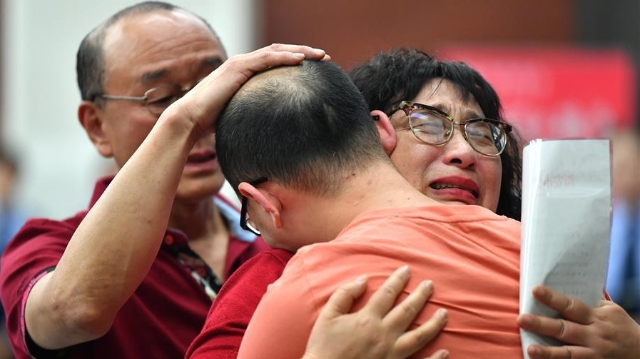5月18日,李靜芝、毛振平(左)與失散32年的兒子團聚。