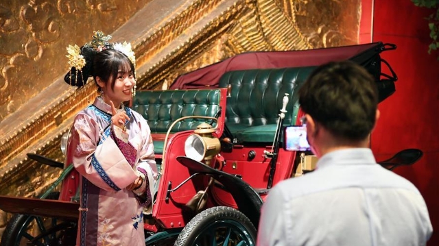 5月18日,在北京汽車博物館,工作人員(左)用講故事的方式通過網(wǎng)絡(luò)直播平臺介紹展品。
