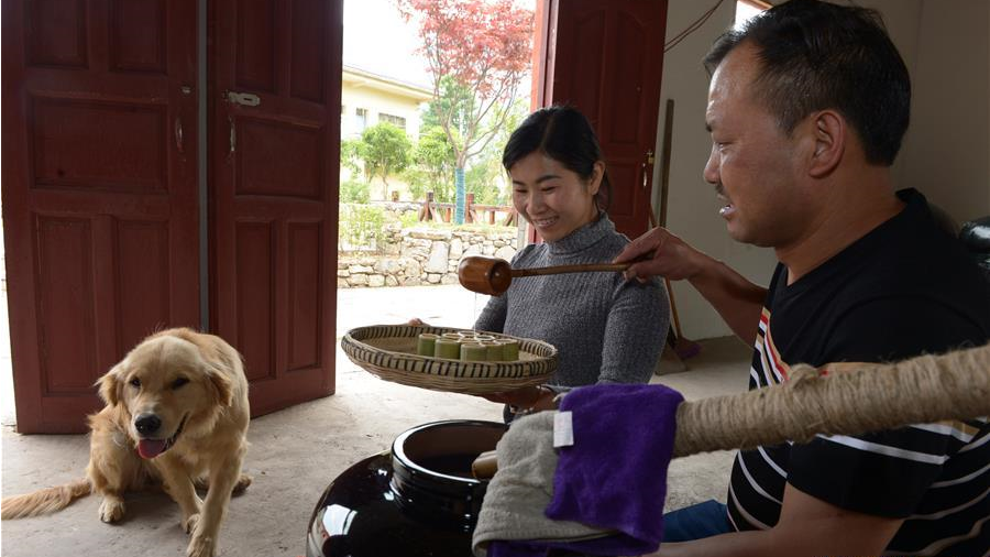 5月12日,浙江諸暨龍溪村的百歲老人蔡渭東在家中處理竹篾。