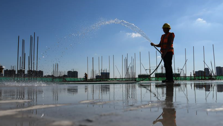 8月3日,工人在長(zhǎng)江文創(chuàng)產(chǎn)業(yè)園項(xiàng)目工地工作平面澆水降溫。