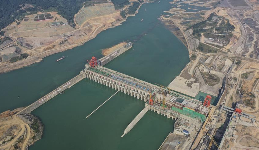 節(jié)日期間,工人們?cè)谖挥趶V西桂平市西江流域黔江河段的大藤峽水利樞紐工程現(xiàn)場(chǎng)加緊施工。