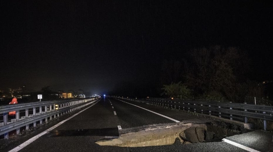 意大利Villafranca dAsti,意大利遭受惡劣天氣和持續(xù)多日的暴雨,通往都靈方向的A21高速公路路面出現(xiàn)“大坑”。