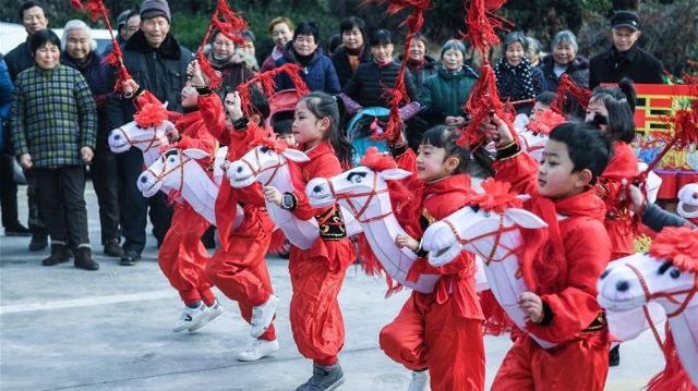 1月16日,孩子們?yōu)樾绿链宕迕癖硌輦鹘y(tǒng)非遺項目——下箬馬燈。下箬馬燈是發(fā)源于長興縣的民間舞蹈,距今已有1000多年歷史。