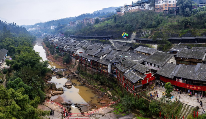 2019年1月26日,重慶中山古鎮(zhèn),880桌“千米長宴”5萬人共品年味。880多張席桌在老街屋檐下一字擺開,“千米長宴”正式開席。