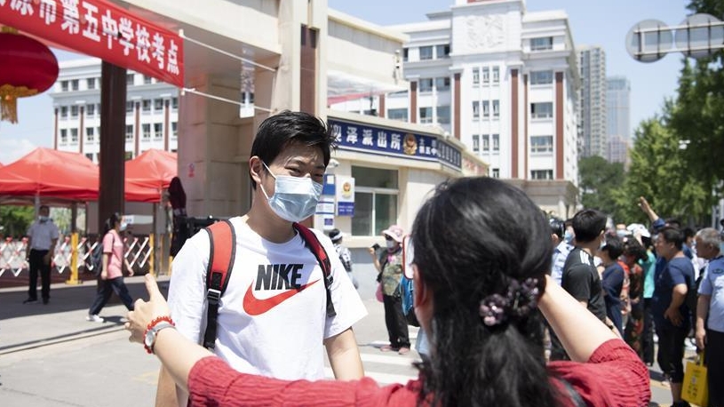 7月7日,在山西省太原市第五中學(xué)??键c(diǎn),結(jié)束首場科目考試的考生走出考場。