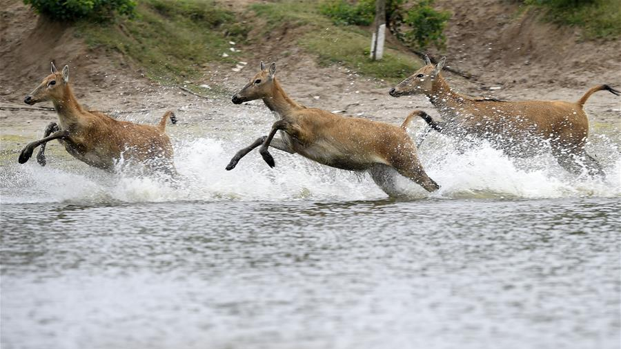 6月10日在江蘇大豐麋鹿國家級自然保護區(qū),麋鹿在水塘覓食。