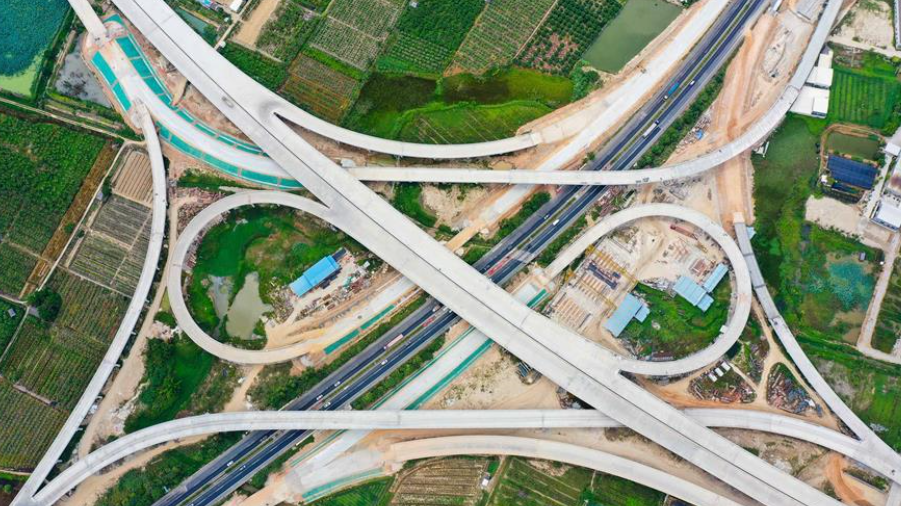 這是已經(jīng)建設完成的潮汕環(huán)線高速公路上北互通立交,沈海高速公路從該互通立交下面穿過(無人機照片,7月31日攝)。