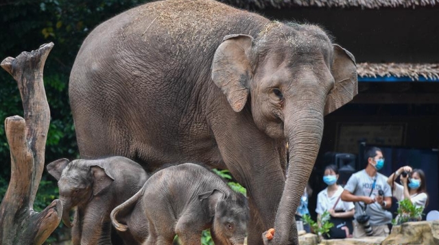正在享受竹子大餐的廣州長(zhǎng)隆野生動(dòng)物世界大熊貓婷仔被大熊貓隆仔搶食,兩只大熊貓上演一場(chǎng)爭(zhēng)食戲碼。