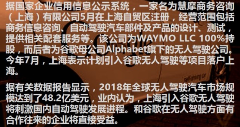 谷歌母公司Alphabet旗下研究自動駕駛的部門Waymo在自動駕駛領(lǐng)域處于全球領(lǐng)先水平,當(dāng)前其已經(jīng)完成800萬英里(約1287萬公里)自動駕駛汽車公共道路測試,模擬測試?yán)锍踢_(dá)到50億英里(約80.47億公里)。Waymo計劃在為今年下半年向部分地區(qū)的美國消費(fèi)者推出無人駕駛服務(wù)。