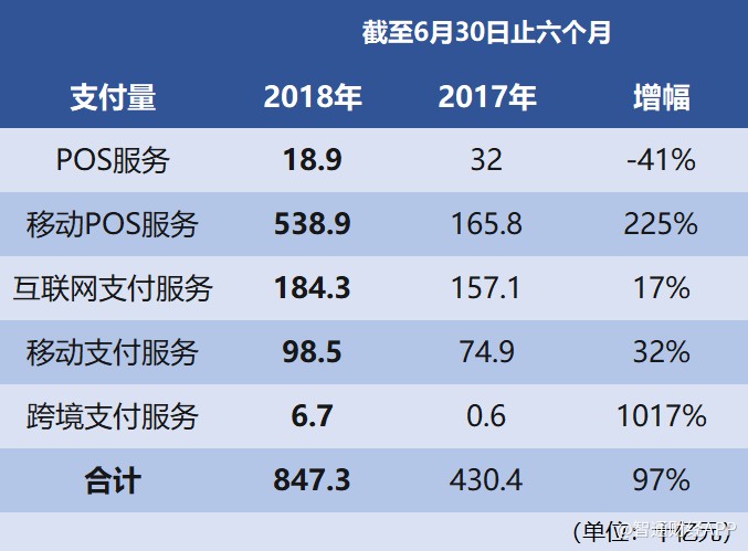 這個(gè)數(shù)據(jù),其實(shí)是比整個(gè)第三方支付行業(yè)的成長(zhǎng)還要高出一半以上的——根據(jù)Frost & Sullivan統(tǒng)計(jì)的行業(yè)數(shù)據(jù),截至2018年底,中國(guó)第三方支付行業(yè)的支付交易總量預(yù)計(jì)將達(dá)到人民幣225.3萬(wàn)億元,較2017年上升47%。