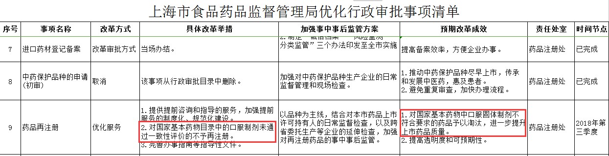 在清單“藥品再注冊”事項中,明確“加強對再注冊藥品的事中事后監(jiān)管”“對國家基本藥物目錄中口服制劑未通過一致性評價的不予再注冊”“對國家基本藥物中口服固體制劑不符合要求的藥品予以淘汰”。