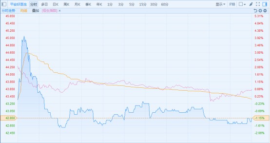 正式納入港股通的平安好醫(yī)生也明顯受到拖累。如果平安好醫(yī)生的分時(shí)圖和恒生指數(shù)的分時(shí)圖疊加,可以看出,平安好醫(yī)生早段有有迅速?zèng)_高的勢頭,但隨后受到大市的影響而轉(zhuǎn)跌,此后走勢與大盤幾乎同步。不過,平安好醫(yī)生走勢相對(duì)穩(wěn)健,最終僅跌1.15%,跑贏恒指,報(bào)價(jià)42.85港元,成交額1777萬港元。