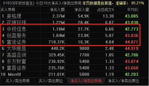 有趣的是,內(nèi)地互聯(lián)網(wǎng)聯(lián)席券商富途證券也出現(xiàn)在平安好醫(yī)生的買方席位上,以平均每股44.071港元,買入1.63萬股,涉及金額71.837萬港元,占總成交額的4.04%。更有趣的是,44.071港元的價(jià)位接近平安好醫(yī)生昨日的最高價(jià),這意味著這批內(nèi)地資金非??春霉荆婚_盤就展開籌碼的爭奪。