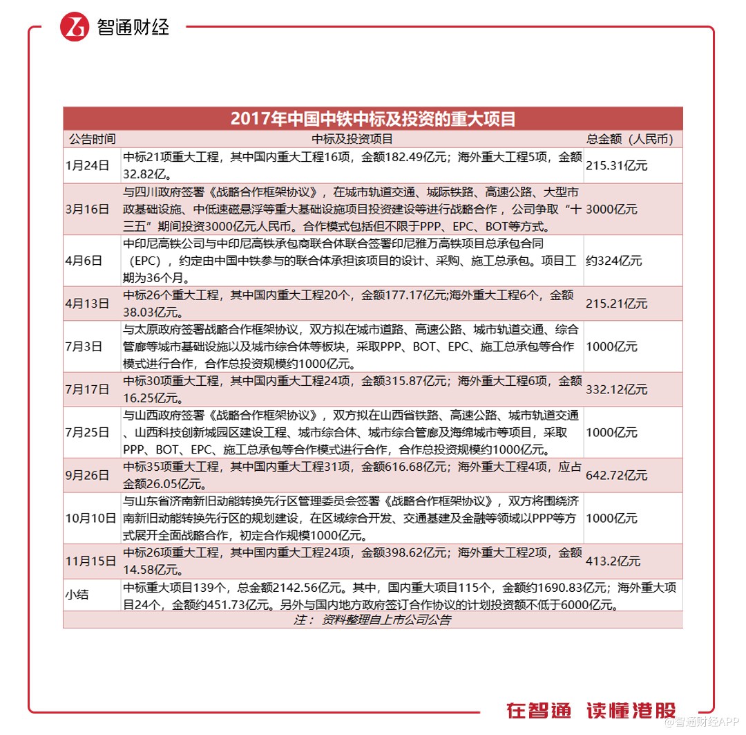 智通財經(jīng)APP注意到,雖然新簽合同金增速放緩,但中標的重大項目卻大幅增加。據(jù)披露,中國中鐵上半年中標的重大工程項目(不含與地方政府簽訂的戰(zhàn)略合作協(xié)議)達到102個,而去年同期僅為49個,涉及項目的金額更是后者的近3倍。