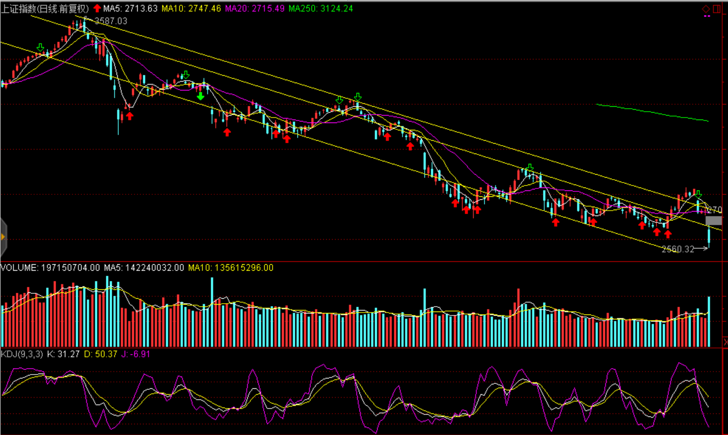 周四兩市股指大幅跳空低開震蕩走低,各大股指均創(chuàng)出2年半以來單日最大跌幅。上證綜指收跌5.22%報2583.46點,深證成指跌6.07%報7524.09點,創(chuàng)業(yè)板指跌6.3%報1261.88點。兩市放量成交3586.21億元,環(huán)比大幅增加1225億元,創(chuàng)近兩個月新高。盤面看僅有西藏、天然氣及人民幣貶值板塊有所上漲外全盤皆綠,市場普跌,超過1000家公司跌停。