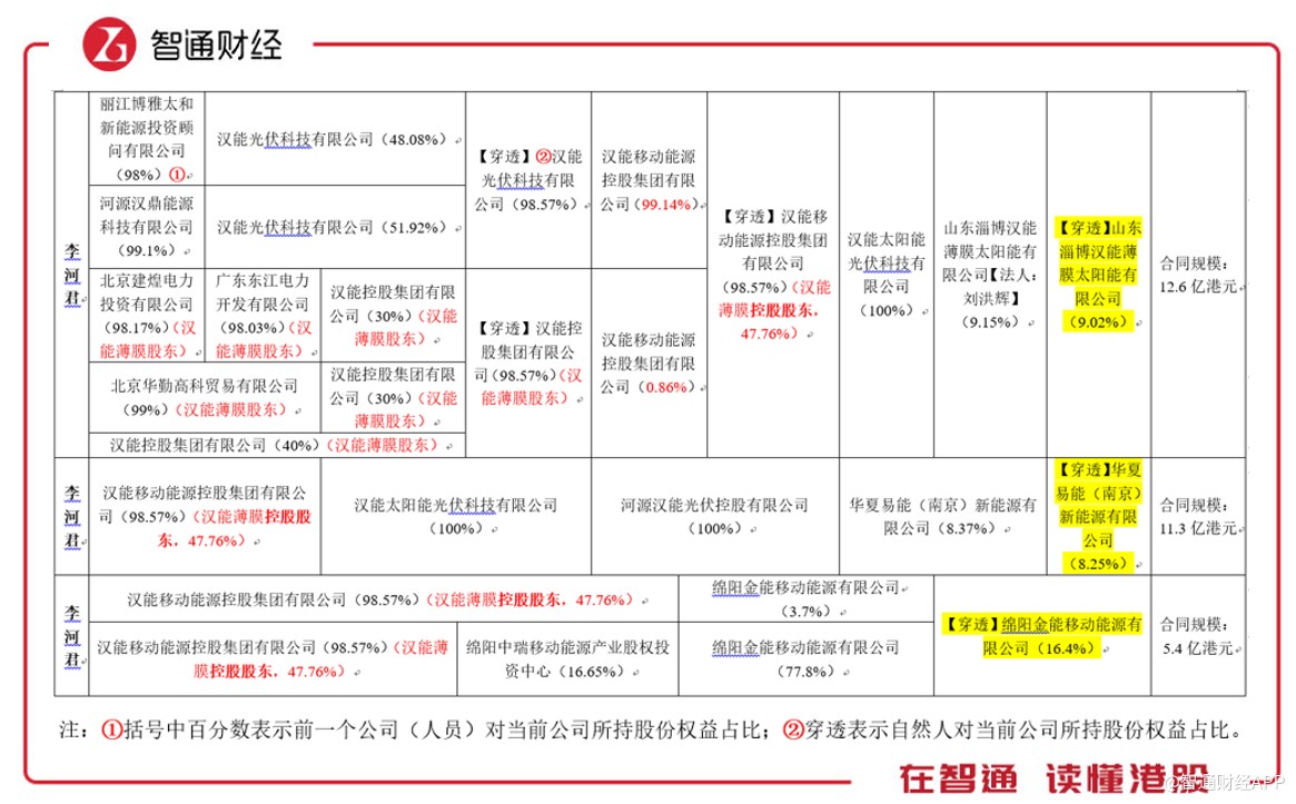 漢能移動(dòng)又通過(guò)持股其它公司,間接持有山東淄博漢能薄膜太陽(yáng)能有限公司(淄博漢能)9.15%股權(quán),穿透股權(quán)發(fā)現(xiàn)李河君持有淄博漢能9.02%股權(quán)。