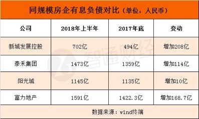 富力地產(chǎn)財(cái)報(bào)數(shù)據(jù)顯示,2015年至2018年三季度,富力地產(chǎn)的負(fù)債總額分別達(dá)1345億元、1795億元、2332億元及2863億元。其中,有息負(fù)債已經(jīng)高達(dá)1600逾億,對(duì)比同規(guī)模的房企,這一數(shù)據(jù)居于同水平房企高位。