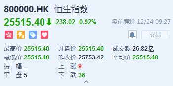 智通財(cái)經(jīng)APP獲悉,恒生指數(shù)開盤跌238.02點(diǎn)或0.92%,報(bào)25515.4點(diǎn)。國(guó)企指數(shù)跌1.1%,報(bào)9990.09點(diǎn)。紅籌指數(shù)跌0.91%,報(bào)4086.09點(diǎn)。大市盤前成交26.82億港元。因圣誕節(jié)假期,港股通北向關(guān)閉,港股今日僅上午開市,下午休市。12月25日(星期二)及26日(星期三)則全天休市,之后恢復(fù)正常。