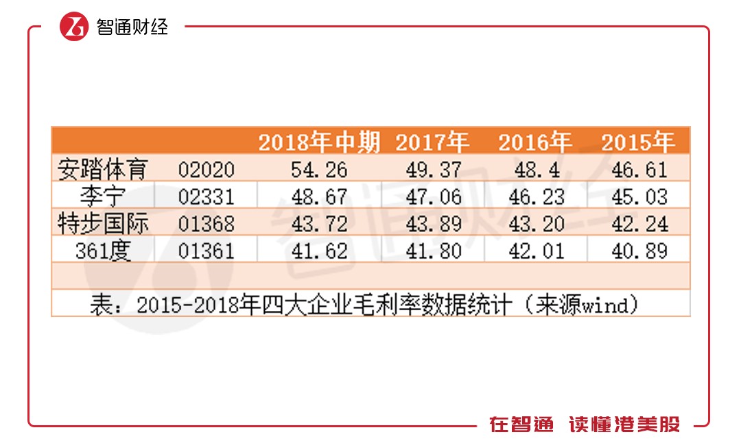 與存貨周轉(zhuǎn)率一起穩(wěn)步增長的,還有毛利率,從2015年的45.03%上升至2018年上半年的48.67%。但與安踏一比,差距就出來了。2015年時,雙方的毛利率差距僅1.58個百分點(diǎn)。但隨著安踏規(guī)模的擴(kuò)大,規(guī)模響應(yīng)逐漸體現(xiàn),李寧與安踏的毛利率差距加大,2018年上半年時,差距擴(kuò)大至5.59個百分點(diǎn),但李寧毛利率仍高于特步和361。