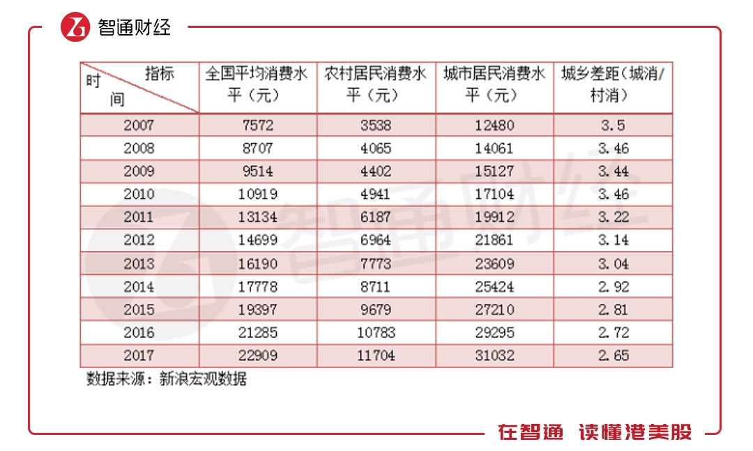考慮到消費能力的變化,根據(jù)新浪宏觀數(shù)據(jù),2008年農(nóng)村的消費水平為4065元,而城市為14061元,城鄉(xiāng)差距3.46倍,不過城鄉(xiāng)差距慢慢降低了,到2017年為2.65倍,彼時農(nóng)村消費水平為11704元,但仍偏低,相當于城市2007年的水平。