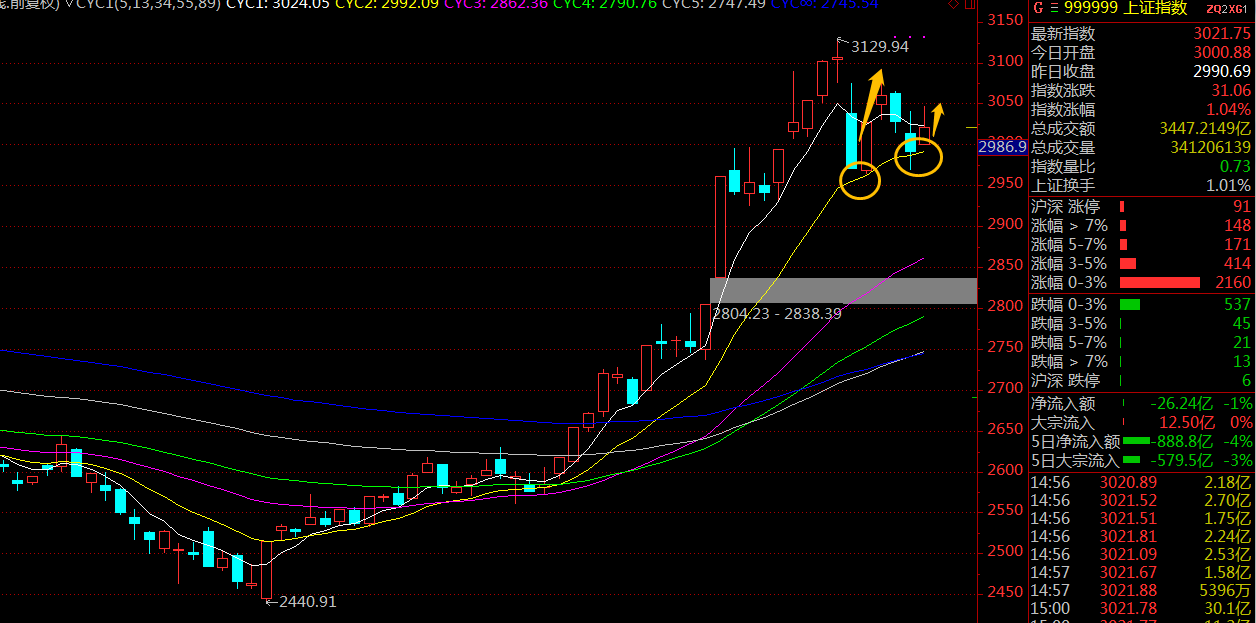 如果能在2938點(diǎn)企穩(wěn),則后續(xù)行情相對(duì)樂觀,也可以在較短時(shí)間內(nèi)完成調(diào)整。同時(shí),結(jié)合日k圖的成本均線指標(biāo)看,兩次回踩十天成本均線,反彈力度呈現(xiàn)出減弱的趨勢(shì),這地方走出第一種走勢(shì)的概率大大增加(跌破2938點(diǎn))。
