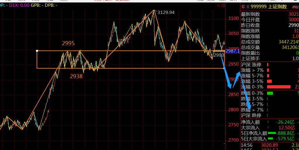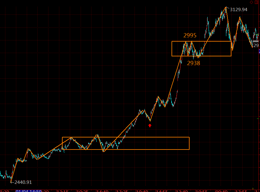 滬指最終選擇了在這個(gè)位置進(jìn)行級(jí)別擴(kuò)張,這里正式進(jìn)入30分鐘級(jí)別的盤整走勢(shì),那么2938點(diǎn)顯得非常關(guān)鍵,跌破該位置后,反抽若不能重新站上去,將繼續(xù)往下擴(kuò)大調(diào)整空間。