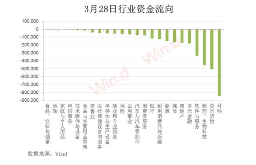 從3月28日行業(yè)主力資金流向來看,絕大多數(shù)行業(yè)出現(xiàn)凈流出,累計(jì)凈流出逾350多億元。其中,材料板塊流出最多,超過80億元;資本貨物、制藥與生物科技板塊凈流出均超過40億元。