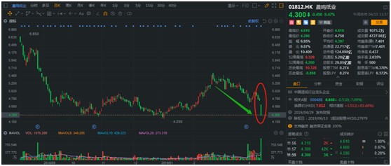 近日,大龍頭紙企晨鳴紙業(yè)(01812)發(fā)布2019年一季度業(yè)績預(yù)告,同比94.25%-96.17%的下滑,直接讓已經(jīng)近30多個交易日不斷下跌的股價,再度迎來大跌。截止4月15日早盤,晨鳴紙業(yè)大跌9.47%,僅半日交易量、成交額達到1075萬股、4728萬港元,是前一整日交易量的近9.5倍。