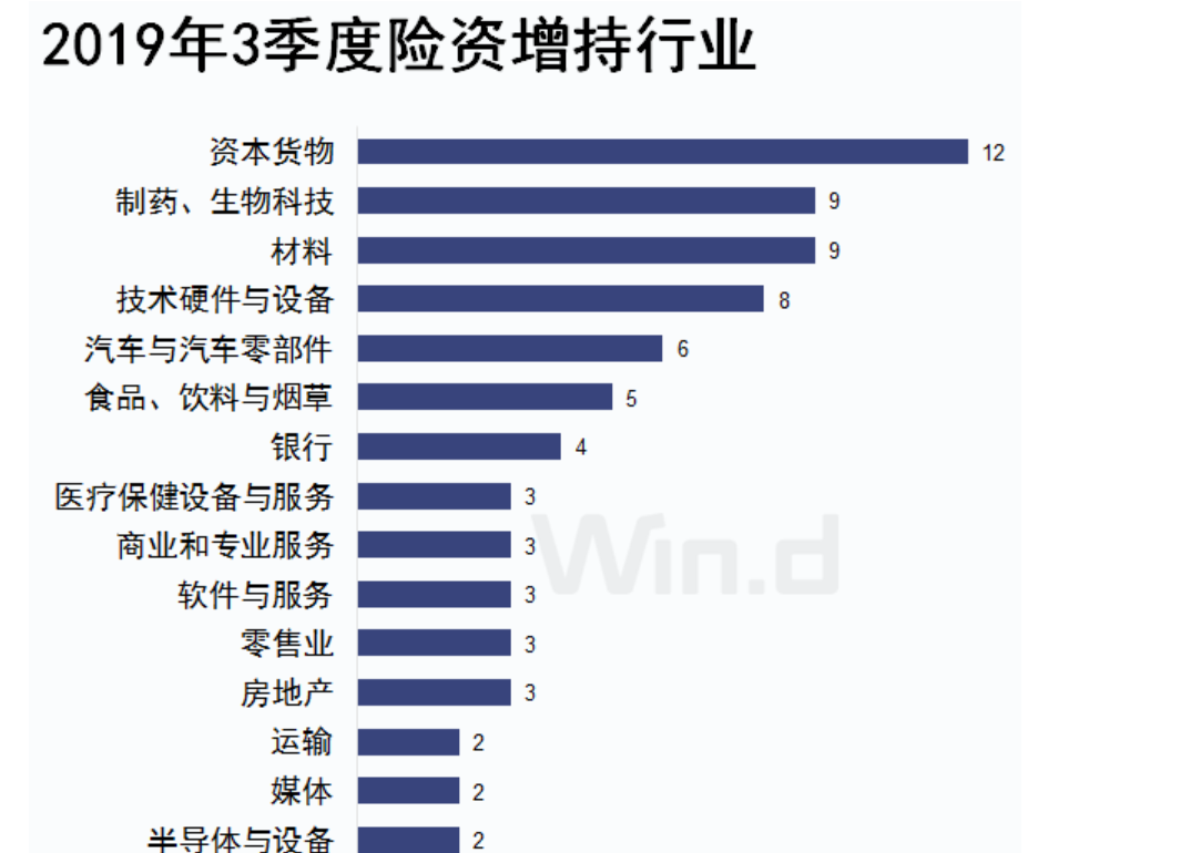 險資財大氣粗,其一舉一動受到資本市場密切關注:據(jù)Wind數(shù)據(jù)統(tǒng)計,截止2019年3季度末,兩市共有376家上市公司被險資持有,持有股數(shù)約為833.21億股;132只保險產品共持有約12380億元市值A股股票。資本貨物、醫(yī)藥、軟硬件、食品等獲重點增持。