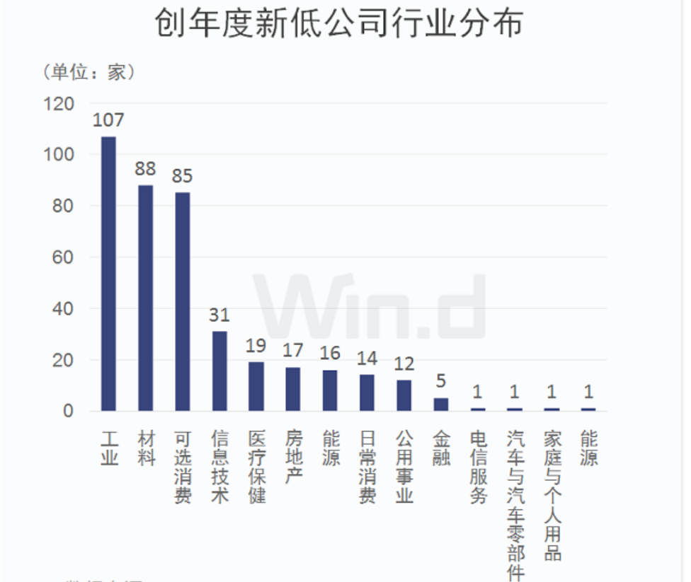 Wind統(tǒng)計(jì)顯示,有395家公司近3日最低股價(jià)創(chuàng)今年以來新低。從相關(guān)公司行業(yè)分布來看,工業(yè)最多,有107家,材料和可選消費(fèi)均有超過80家。可見,雖然股指整體上漲,但傳統(tǒng)工業(yè)、材料領(lǐng)域投資者普遍不太看好。