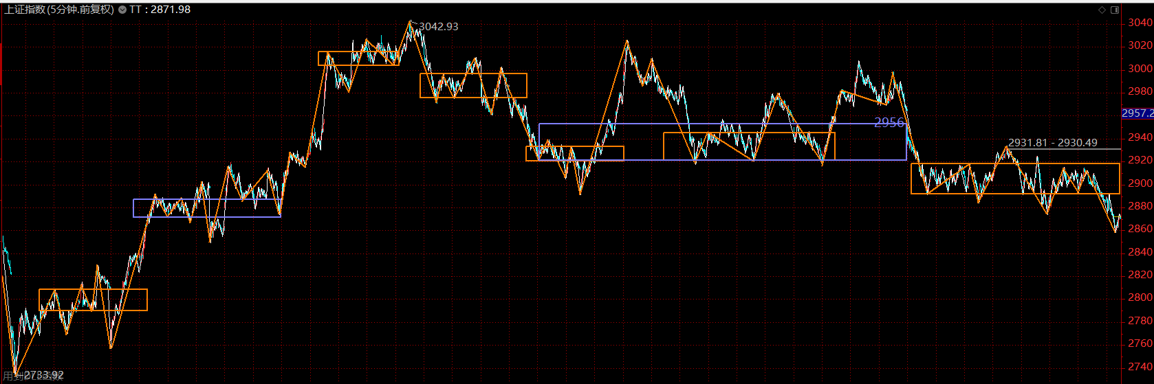上證指數(shù)上周在等待中樞擴(kuò)展完成后破位下跌,破位力度比較小,而對(duì)結(jié)構(gòu)分解后發(fā)現(xiàn),這次大中樞的盤整背馳,第一段以五分鐘趨勢(shì)的形式完成,第二段以盤整的形式完成,且已進(jìn)入了尾聲。因此,料此輪主跌段不會(huì)太久,繼續(xù)維持在前序中樞下軌2850附近企穩(wěn)的判斷。
