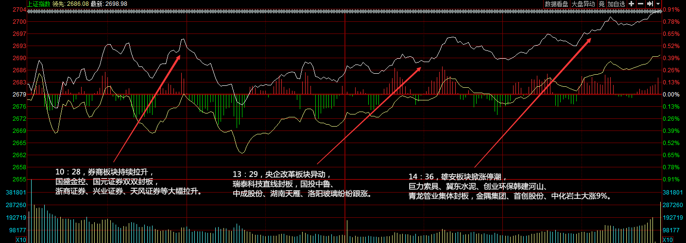 兩市開盤漲跌不一,創(chuàng)業(yè)板明顯弱于主板,ST板塊偃旗息鼓,券商、地產(chǎn)等板塊走強(qiáng)帶動(dòng)滬指上行。午后指數(shù)震蕩走高,雄安新區(qū)尾盤掀起漲停潮,滬指連漲三日重返2700點(diǎn)。