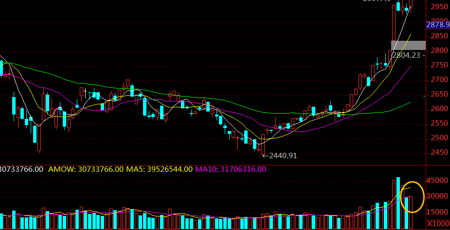 周四周五市場成交量較周初有較大幅度的回落,在高位股分批次殺跌的背景下,市場情緒高點已過。
