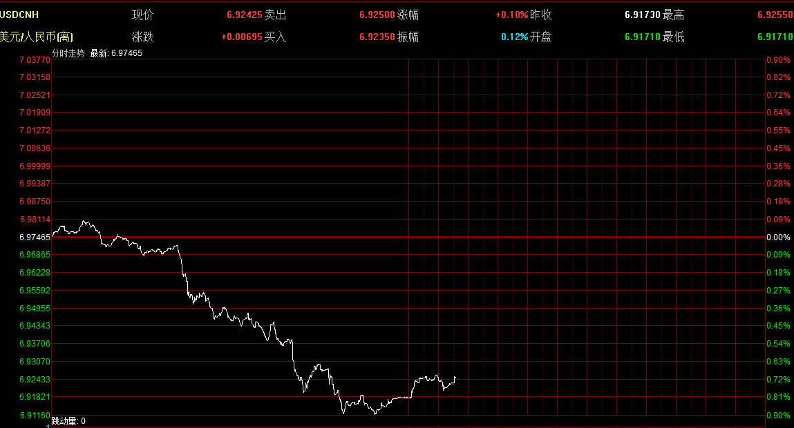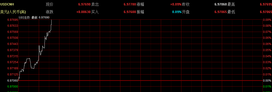 10月30日,離岸人民幣兌美元匯率再度跌破6.97關口,盤中觸及6.9773低點,創(chuàng)10年來新低。截至19時15分報6.9732,貶值16基點:在岸人民幣即期匯率報6.9639,貶值17基點。