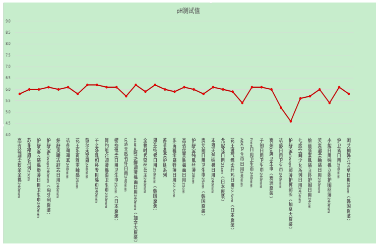 女性特殊時期的抗病能力大大降低,而與皮膚密切接觸的衛(wèi)生巾的酸堿度即pH值是關乎女性特殊時期健康的重要因素。據(jù)婦幼保健醫(yī)生介紹,衛(wèi)生巾的pH值在弱酸性至堿性對人體最安全。本次比較試驗35款衛(wèi)生巾pH值測試結果均在4.5到6.5之間,對人體無害。pH值測試結果見下圖。