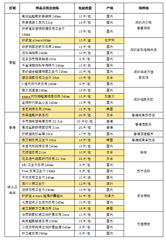 據(jù)前期調研發(fā)現(xiàn),國外品牌衛(wèi)生巾更受女性消費者青睞,很多消費者認為國外品牌衛(wèi)生巾質量更優(yōu)更值得信賴,進而選擇跨境或海淘等方式購買國外產(chǎn)品。因此,本次樣品分別從深圳商超、香港、線上海淘購買樣品進行測試和比較,樣品涉及11款國外原裝產(chǎn)品。詳見下表。