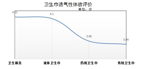 在本次主觀體驗(yàn)透氣性方面,衛(wèi)生棉條評(píng)價(jià)最高,平均得分4.11分;其次是液體材料衛(wèi)生巾,平均得分4.1分;藥用衛(wèi)生巾和傳統(tǒng)型衛(wèi)生巾透氣性評(píng)價(jià)稍遜,平均得分分別為3.96和3.94分。
