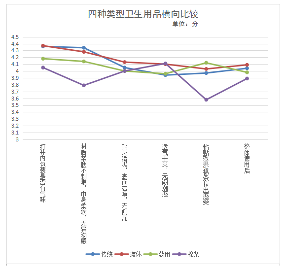 本次衛(wèi)生巾比較試驗(yàn)共招募150名目前沒有從事有關(guān)衛(wèi)生巾行業(yè)的年齡介于16-45歲之間的消費(fèi)者分別對(duì)傳統(tǒng)型衛(wèi)生巾、新型衛(wèi)生巾(液體材料衛(wèi)生巾)、衛(wèi)生棉條、功能性(藥用)衛(wèi)生巾四種類型商品進(jìn)行體驗(yàn)。要求體驗(yàn)消費(fèi)者對(duì)所使用的衛(wèi)生用品進(jìn)行1-5分的評(píng)價(jià)(1分最低,5分最高),主要體驗(yàn)內(nèi)容及感受如下: