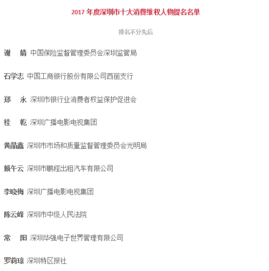 附:“2017年度深圳市十大最美消費維權(quán)人物”名單(排名不分先后)