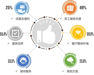本次調查從餐廳整體環(huán)境、服務效率、員工服務態(tài)度、接待服務、優(yōu)惠及福利及其他方面等六個維度展開,其中餐廳整體環(huán)境與服務效率是消費者最主要推薦的原因,餐廳整體環(huán)境推薦比例最高,為55.9%。