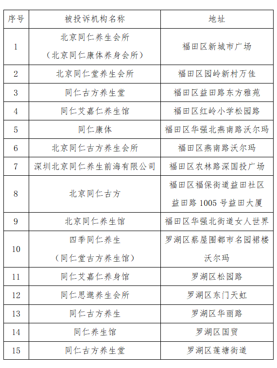 具體被投訴機(jī)構(gòu)名單(由消費者提供的名稱及地址)如下: