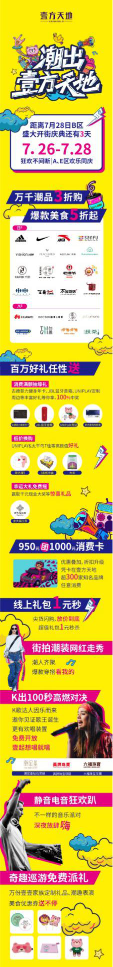 開(kāi)業(yè)期間,精彩紛呈的活動(dòng)當(dāng)然是必不可少的。7.26-7.28開(kāi)業(yè)期間,B區(qū)將聯(lián)動(dòng)A區(qū)、E區(qū)開(kāi)展一系列活動(dòng)。開(kāi)業(yè)活動(dòng)緊扣B區(qū)定位“潮流品味先鋒主場(chǎng)”,充分抓住當(dāng)下年輕人愛(ài)玩、敢玩的特色,將整個(gè)壹方天地變?yōu)槌比?、炫酷的歡樂(lè)海洋。