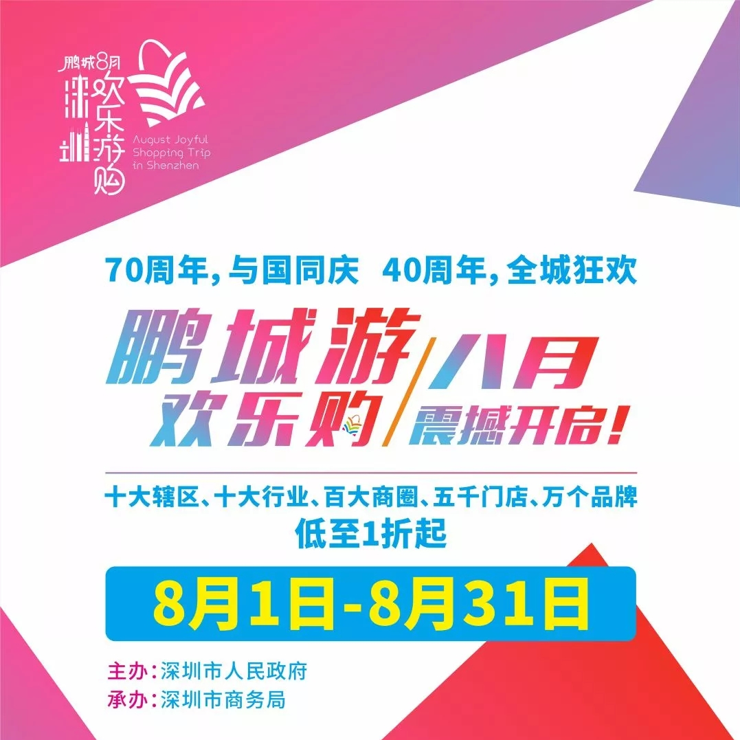 8月1,2019年“鵬城八月歡樂游購”系列促消費(fèi)活動正式拉開帷幕,活動以“鵬城游·歡樂購”“深圳let’s購”“深圳不限購”“樂享盛夏·歡購鵬城”等為口號,整個8月將在全市營造“天天有優(yōu)惠、周周有活動、行行促消費(fèi)、區(qū)區(qū)有特色”的氛圍。搶抓中央打造粵港澳大灣區(qū)和大力發(fā)揮消費(fèi)基礎(chǔ)性作用的雙重機(jī)遇,以激發(fā)居民消費(fèi)潛力為目的,以舉辦大型促消費(fèi)活動為手段,以開展大規(guī)模宣傳造勢為驅(qū)動,推廣宣傳深圳制造、深圳品牌和深圳設(shè)計(jì),結(jié)合暑期消費(fèi)熱點(diǎn),發(fā)揮濱海旅游資源優(yōu)勢,吸引國內(nèi)外最具活力和消費(fèi)力的年輕人群齊聚深圳,共同享受夏日的購物狂歡盛宴。此外,以本次活動為起點(diǎn),從2019年開始,深圳市將在每年8月作為“鵬城歡樂游購”月定期舉辦。通過3-5年的持續(xù)打造,力爭將其辦成規(guī)模最大、影響力最強(qiáng)、知名度最高的國內(nèi)一流的促消費(fèi)活動,成為深圳城市的一張靚麗名片。